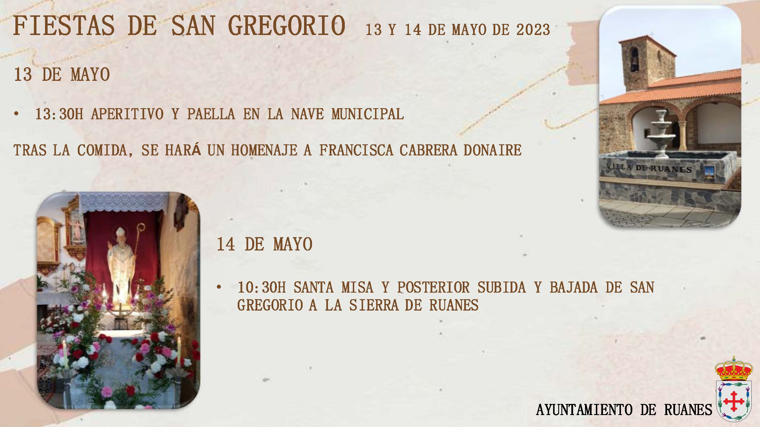 Fiestas de San Gregorio 02 mayo 2023 Las fiestas en honor al San Gregorio se celebraran el próximo 13 y 14 mayo, para mas información ver cartel adjunto.